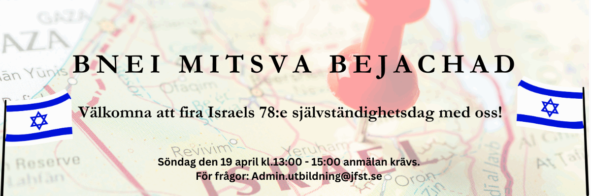 På söndagen 19 april ses vi för att fira jom haatsmaut tillsammans! Det blir en eftermiddag med Israeltema: kom och lär dig om Israel, ät israeliska snacks och gör roliga aktiviteter kopplade till Israel.